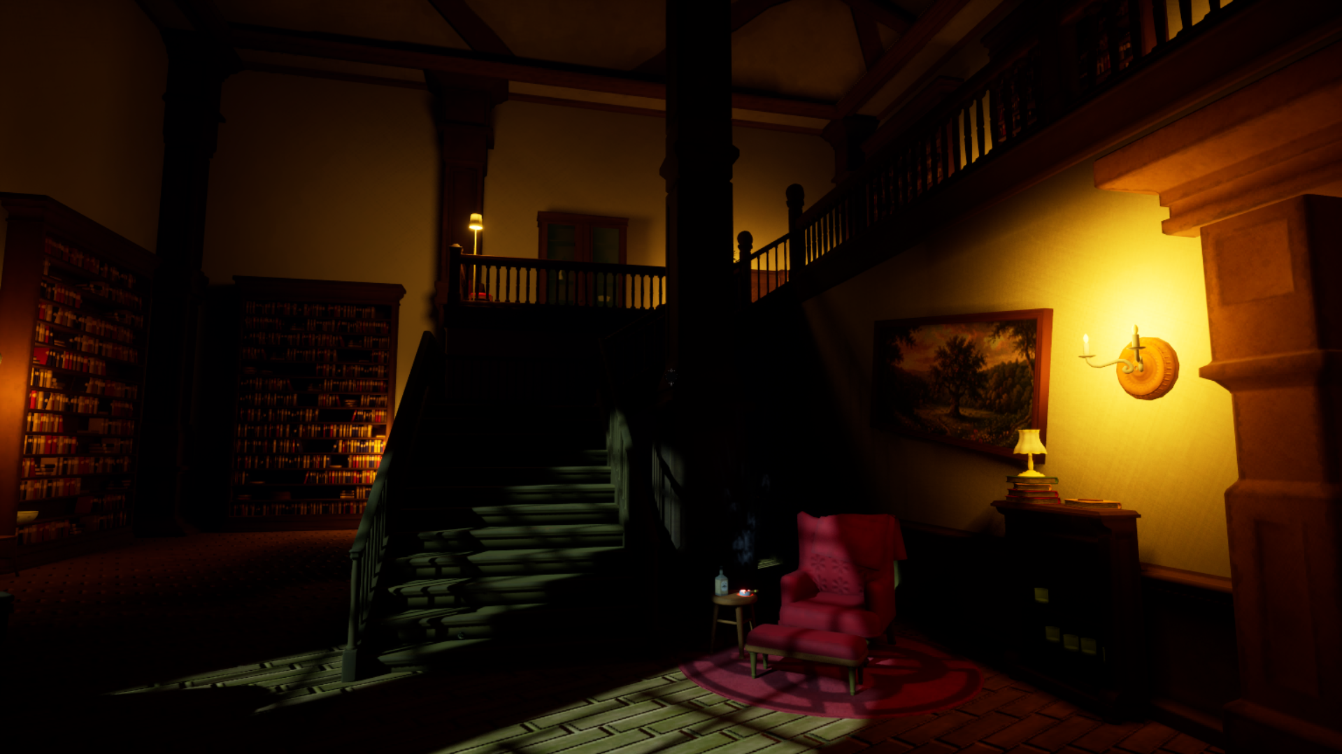 Explore the two floors of a detailed Art Deco library trembling under the cold light of an unnatural full moon. Discover what happened to James Thorne, who fled from a beast, and what dark secret waits behind the locked door upstairs.