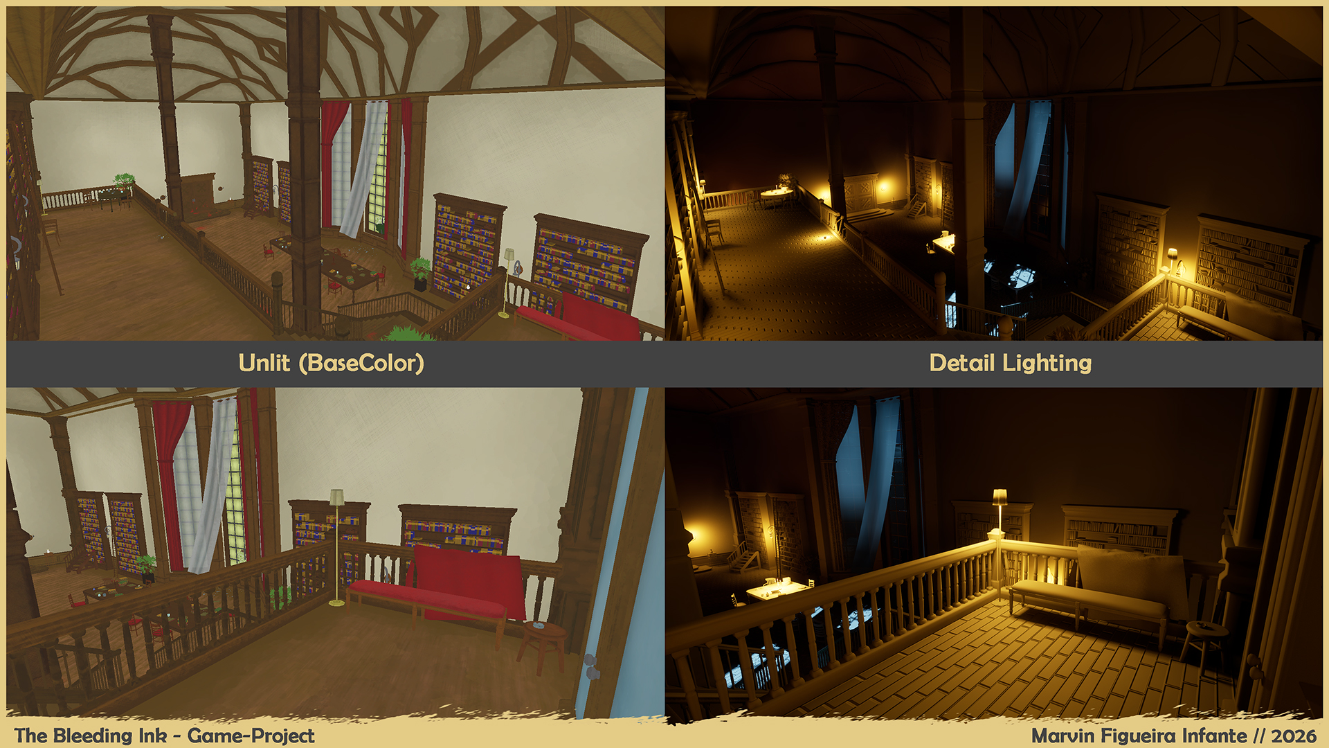 The Bleeding Ink was developed as a student project with a clear goal: creating a dense, narrative atmosphere through detailed environmental storytelling. The entire level was modeled in Blender. I focused heavily on Art Deco architecture and organic destruction (bullet holes, claw marks) to make the history of the struggle physically tangible. In Substance Painter, I worked extensively on contrasting surfaces and stylized texturing. This was the heart of my learning journey.